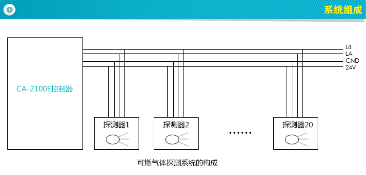 CA-2100E型可燃气体报警器由CA-2100E型可燃气体报警控制器配套CA-217A-B型点型可燃气体探测器一起使用;采用先进的微机处理技术;.巡检方式工作;四总线信号传输:电源正极,电源负极,通信线LA,通信线LB;实时浓度滚动循环显示;中文彩色液晶显示,触摸键盘;实时时钟显示,掉电不掉失;报警优先于故障,探测器故障报警;报警保持,最先报警通道指示;采用RS485工业现场总线,防雷保护。CA-217A-B型点型可燃气体探测器采用先进的进口催化燃烧式传感器;性能稳定,灵敏可靠,使用寿命长;抗中毒性能好,抗干扰能力强;自动校正零点,可避免长期工作的零点漂移引起的测量误差;浓度信号输出,报警时控制器会发出声光报警。